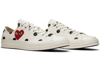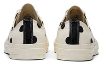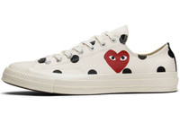 PRODUCT INFORMATION MODEL NO: 157249C RELEASE DATE: 2012-02-17 SERIES: COMME des GARCONS PLAY NICKNAME: Cement STYLE: Sports SEASON: All Season DESIGNER: Tinker Hatfield CLOSURE: Lacing TOE TYPE: Round Toe HEEL TYPE: Flat heel COLOR WAY: White/Black/Tech Grey DESCRIPTION Introducing the Converse Comme des Garcons x Chuck Taylor All Star 70 Low Polka Dot sneaker. This unique sneaker celebrates the iconic 70s silhouette in a collaboration with Japanese label CDG PLAY. The low-top design features a cream-based upper adorned with an allover black polka dot design. The signature CDG PLAY heart-and-eyes motif, originally designed by New York artist Filip Pagowski, makes a few appearances throughout the shoe. Tonal laces, silver hardware, and an Off-White rubber toe cap complete the design of this must-have sneaker.