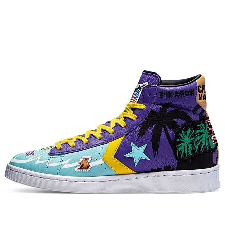 PRODUCT INFORMATION Model No: 171240C Closure: Lacing Release Date: 2021-03-11 Style: Street Style/Trendy Colorway: Purple Heel Type: Flat heel Toe Type: Round Toe Sole Material: Rubber Sole Functionality: Slip-resistant/Wearable/Lightweight/Ventilative Season: All Season Color: PURPLE Series: Pro Leather Nickname: Lakers Championship Jacket Occasion: lifestyle The Chinatown Market x Converse Pro Leather High 'Lakers Championship Jacket' is a limited edition shoe that celebrates the LA Lakers' 2002 NBA championship. The shoes feature bold colors and oversized graphics that replicate the look of the championship leather jackets made by designer Jeff Hamilton for the Lakers. A callout to Hamilton and Chinatown Market appears on the tongue tag, while the latter brand's logo is stamped on the heel tab. These shoes are a must-have for any Lakers fan or streetwear enthusiast.