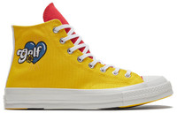 PRODUCT INFORMATION Model No: 169910C Closure: Lacing Release Date: 2020-09-13 Upper Material: Canvas Style: Trendy/Street Style Colorway: Blue/Yellow/Red Heel Type: Flat heel Toe Type: Round Toe Sole Material: Rubber Sole Functionality: Wearable/Slip-resistant Season: All Season Color: multi-color Series: Chuck 70 Sub Series: Chuck 70 High Nickname: Tri-Panel Occasion: lifestyle Converse and Tyler, the Creator present the Golf Wang x Chuck 70 High 'Tri-Panel.' A vibrant take on the classic Chuck 70, this sneaker features a canvas upper with discordant paneling in a mix of yellow, blue, red, and black finishes. A traditional All Star patch is present on the medial ankle, while heart-shaped Golf embroidery adorns the opposite side. An oversized Golf Wang smiley face graphic connects the outsole of the left and right shoe.