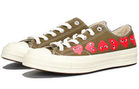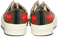PRODUCT INFORMATION Model No: 162976C Closure: Lacing Release Date: 2018-04-05 Style: Trendy Colorway: White/Black Heel Type: Flat heel Toe Type: Round Toe Sole Material: Rubber Sole Functionality: Slip-resistant/Wearable Season: All Season Color: green Series: COMME des GARCONS PLAY Sub Series: Chuck 70 Low Nickname: Khaki Occasion: lifestyle Comme des Garcons Play, the Japanese label known for its unconventional designs, has teamed up with Converse to create the Chuck 70 Low Top 'Multi Heart' sneaker. The shoe's canvas upper is Khaki Green, with Comme des Garcons' iconic heart-shaped logo with eyes on the medial and lateral sides. A black stripe at the heel provides structure and contrast, while white stitching throughout gives the shoe a clean look. The rubber midsole and outsole complete the simple yet stylish design. Whether you're hitting the streets or the court, this sneaker is sure to turn heads.