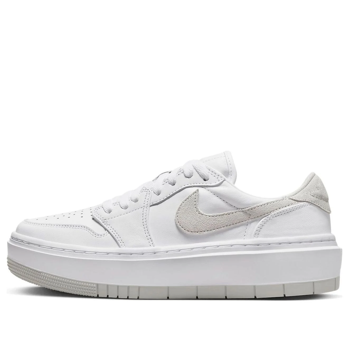 PRODUCT INFORMATION MODEL NO: DH7004-110 RELEASE DATE: 2023-02-01 SERIES: Air Jordan 1 NICKNAME: Neutral Grey THICKNESS: Regular Thickness CLOSURE: Lacing UPPER: Low Cut TOE TYPE: Round Toe HEEL TYPE: Flat heel COLOR WAY: White/Neutral Grey DESCRIPTION The Air Jordan 1 Elevate 'Neutral Grey' is a stylish sneaker that features a white leather base with a grey velvet Swoosh and a high heel. The improved thick white sole and grey rubber outsole, with the iconic 'Wings' logo on the back, is complemented by a softwood insole. This sneaker is perfect for a variety of activities, from casual days out to intense workouts. Inspired by the classic Air Jordan 1 silhouette, this series offers a timeless design that will never go out of style.