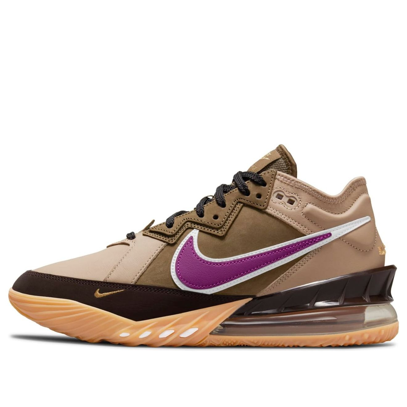 PRODUCT INFORMATION Model No: CW3153-200 Closure: Lacing Release Date: 2021-05-03 Upper Material: Leather Thickness: Regular Sole Style: Practical Colorway: Khaki Heel Type: Flat heel Toe Type: Round Toe Upper: Low top Sole Material: Rubber Sole Season: All Season Color: brown Series: LeBron Sub Series: LeBron 18 Nickname: Viotech Occasion: basketball Country Of Origin: VN Algolia Object Id: 6ab7d6f4-1665-42a1-940d-1fcae08dc932 The atmos x Nike LeBron 18 Low 'Viotech' is a special edition collaboration between the renowned Tokyo-based retailer and Nike. This shoe features a familiar color scheme that takes direct inspiration from a coveted Air Max 1 collaboration from 2003. The LeBron 18 Low 'Viotech' is constructed with a leather and suede upper in muted earth tones, and features a bold purple Swoosh on the side panel. A secondary mini-Swoosh in gold embroidery decorates the dark brown suede mudguard. This shoe is equipped with lightweight cushioning thanks to a large-volume Max Air heel unit with a Nike React midsole. The gum rubber outsole wraps up the sidewalls for added durability.