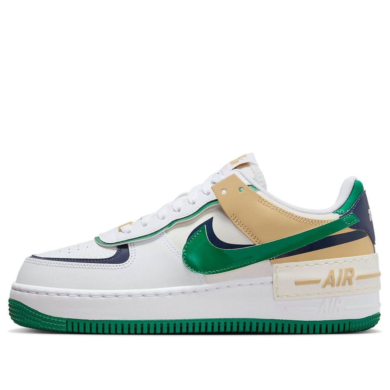 PRODUCT INFORMATION Model No: DZ1847-102 Closure: Lacing Release Date: 2023-12-19 Upper Material: Synthetic Leather Colorway: White/Malachite/Sesame/Midnight Navy Heel Type: Flat heel Toe Type: Round Toe Upper: Low Top Sole Material: Rubber Sole Color: white Series: Air Force Sub Series: Air Force 1 Shadow Nickname: White Malachite Sesame Occasion: lifestyle