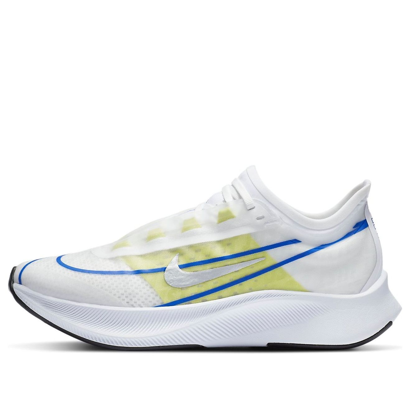 PRODUCT INFORMATION Model No: AT8241-104 Closure: Lacing Release Date: 2021-01-21 Style: Sports/Trendy Colorway: White/Blue/Yellow Heel Type: Flat heel Toe Type: Round Toe Sole Material: Rubber Sole Season: All Season Color: WHITE Series: Zoom Fly Nickname: White Silver Blue Lime Occasion: running
