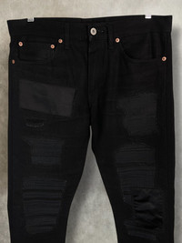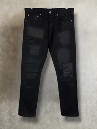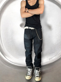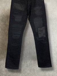 Fw2015 Junya Watanabe patchwork black denim pants *Condi:8/10 *Excellent condition with light sign of using The pre-distressed boro stitching on these pants is reinforced with satin fabric and copper hardwares, while the back panel is composed of wool exterior with cupro lining and the rear pockets as well as the cinchable belt are composed of a blend of rayon and wool fabric Size:Medium Waist:34 Outseam:40 Inseam:31 Crotch:10 Thigh:11 Knee:8 Leg opening:7