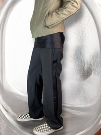 Ss2006 junya watanabe mohair/wool cummerbund trousers *Condi:8/10 *Excellent condition with normal sign of using The surface of these straight fitting pants is composed of wool and mohair blend with cupra lining, while the side strip and cummerbund are constructed of silk and cupra combination Size:Medium Waist:32 Outseam:37.5 Inseam:28 Crotch:10 Thigh:10.5 Knee:9 Leg opening:9