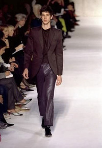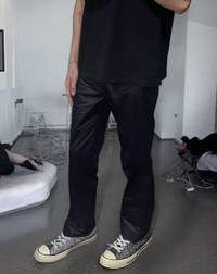 SS 2000 Costume National flared coated nylon trousers *Condi:10/10 *Brand new complete with hang tags These early 2000s CNC pants features an oblique pockets and hook clasp mechanism on the leg opening for a flared or more slick look. Made of polyester and cotton blend with a glossy coating Size:40 Waist:30 Outseam:36.5 Inseam:28 Crotch:8 Thigh:11 Knee:8.5 Leg opening:8.3/6