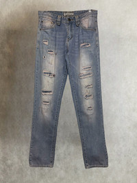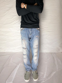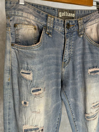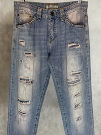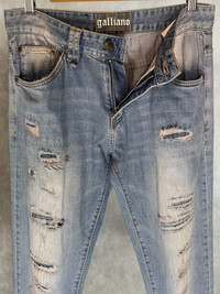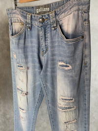 John galliano distressed denim pants *Condi:7/10 *Good condition with visible sin of wear and tear Size:32 Waist:32 Outseam:42 Inseam:32.5 Crotch:10 Thigh:11.5 Knee:8.5 Leg opening:7
