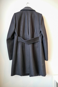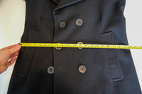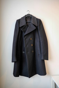 Rick Owens Double Breasted Long Military Coat RU 2955/L. Made in Italy. Condition: Modified condition 7/10. Flaws to mention: Shoulder padding removed and shoulder seams sewn again. Back darts has been let out slightly and the back seam gusset was opened and then sewn shut again (there wasn't a way to let out any fabric). Center lining seam was the entry point and that has been sewn shut. Front buttons were repositioned. Other than these modifications this coat has been used like 5 times. Maybe have a tailor bring this back to original state if it fits you. Check the pics, I have tried to capture everything. Size: M, Fits a little slim and long. Check the pictures for measurements. Material: 70% Wool, 24% Nylon, 6%Polyurethane. Lining 30% Cotton, 27% Acetate, 23% Rayon, 20% Silk. Color: Black (pics may show color a little lighter (to show textures and everything) All sales are final. No returns or refunds. Ask any questions beforehand and I'll be happy to answer them.
