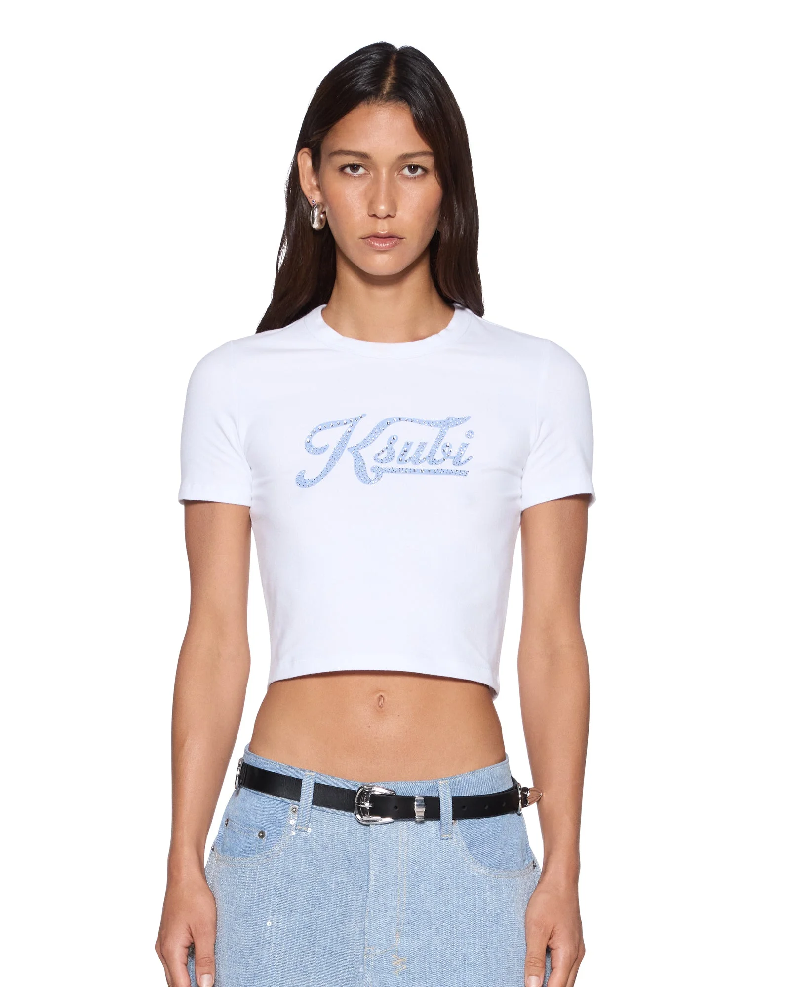 The Ksubi Bling Baby Short Sleeve Tee White is a fitted baby tee with a crew neck, short sleeves, and cropped length. Crafted from a premium cotton and elastane blend jersey in white, the style features seasonal Ksubi branding on the front with diamante applique detailing and signature T-box embroidery. Style as an essential with any Ksubi denim. FEATURES, SIZE & FIT - Fitted baby tee with crew neckline and short sleeves - Cropped length - Ksubi diamante applique on front chest - T-box branding - Inner hem foil print - 100% cotton - Model is wearing a size 26/S, height 179cm/5'9", bust 76cm, waist 61cm, hip 94cm - Cool machine wash with like colours, wash inside out, do not bleach, remove promptly after wash, do not tumble dry, cool iron on reverse, do not iron directly onto prints or metal hardware, colour may transfer onto other garments and upholstery
