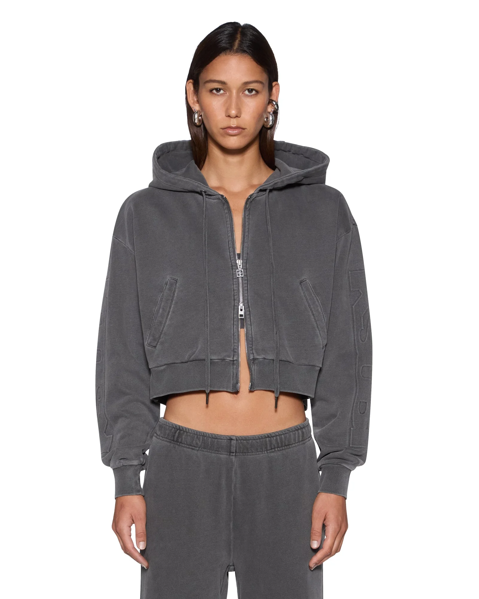 The SOTT Origin Hoodie Charcoal features a relaxed cropped fit with ribbed cuffs and hem in a seasonal grey colorway with an aged wash. Crafted from premium cotton loop-back fleece, it includes a double-ended zip closure for versatile styling, Ksubi branded anti-silver hardware, and front welt pockets. Detailed with SOTT embossed branding down the sleeves, tonal t-box, and 3x4 embroidery, this hoodie is both stylish and functional. FEATURES, SIZE & FIT - Relaxed fit hoodie with cropped length - Dropped shoulders with zip-through front - Ribbed hem band and cuffs - Side welt pockets - T-box branding - 3x4 cross embroidery - Branded hardware with embossed sleeve branding - Some stretch, 100% cotton - Size S length (shoulder to hem): 49cm / 12 1/4" - Size S chest circumference: 112cm / 44" - Model is wearing a size 26/S, height 178cm/5'10", bust 80cm, waist 62.5cm, hip 92cm - Care: Cold machine wash with like colours, wash inside out, do not bleach
