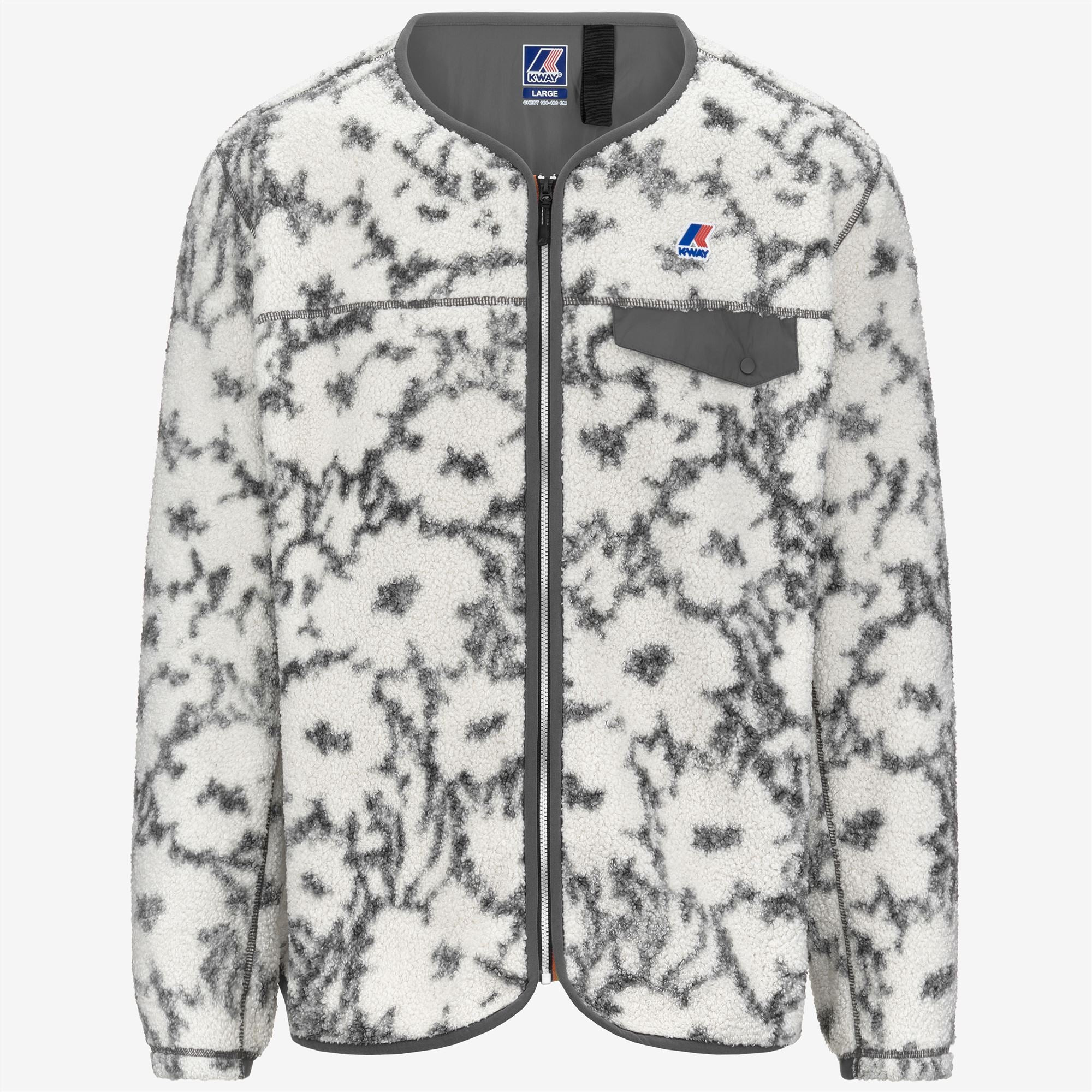 Grey floral Unisex Cardigan for Outdoor Activities with Zip Fastening Aristide is a cardigan designed for outdoor activities, sports and leisure. Ideal for mid-season wear, it is made from warm, soft sherpa-effect fabric with an all-over floral print and contrasting lining. Featuring a zip fastening with nylon trim, it offers comfort, freedom of movement and low-bulk protection. - Printed sherpa-effect fabric with contrasting lining - Medium warmth rating - Zip fastening with nylon trim - Chest pocket with nylon flap and snap button - Cuffs with internal elastic trim - Front opening and hem with internal elastic binding - Regular fit - Colour-printed logo Features Description: Fleece, Cardigan Gender: Unisex Season: Fall, Winter Composition Entire: 100% Polyester Style: K3147UW - Color: A00