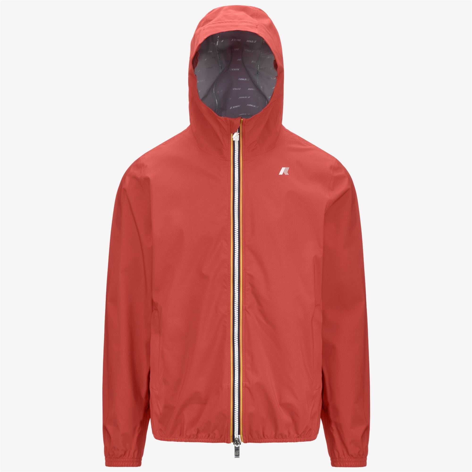 Brown red Men's Waterproof Slim Fit Transitional Jacket Jack is a men's short slim fit jacket, perfect for transitional seasons. It's crafted from stretch technical fabric that allows for unrestricted movement while providing rain and wind protection, with water resistance up to 10000 mm. The interior is lined with an insulating membrane with all-over silver-tone K-Way lettering print. Functional details, such as zipped pockets, a wrap-around adjustable hood, and elasticated cuffs and hem ensure an easy, comfortable fit. - Waterproof, windproof and breathable stretch polyester fabric - DWR (Durable Water Repellent) treatment - Water resistance: 10000 mm water column - Logo-printed interior membrane - Heat-taped seams - Adjustable drawstring hood with stoppers - Zip fastening - Elasticated cuffs and hem - 2 zipped pockets - Slim fit - White printed logo Features Description: Jackets, Short Gender: Man Season: Spring, Summer, Fall, Winter Composition Entire: 24% Poliuretane, 76% Recycled Polyester Style: K5127QW - Color: 703
