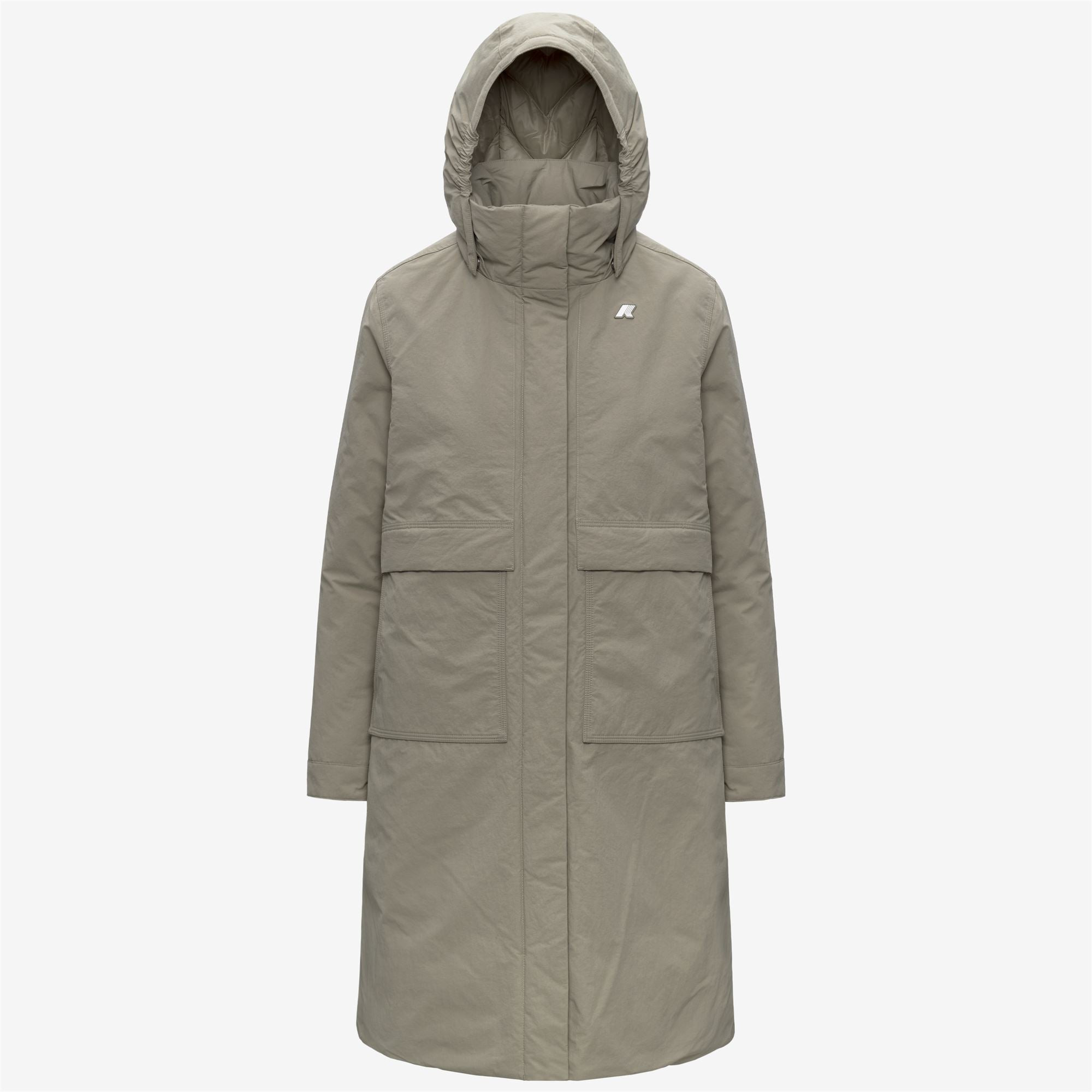 Kalisha is a women’s long A-line jacket, designed for transitional seasons and early cold spells. Made from a water-repellent, windproof nylon-cotton blend and padded with PrimaLoft® insulation, it offers reliable protection in unpredictable weather. Details include a covered zip fastening, an enveloping high collar, a detachable hood, and generous pockets. - Water-repellent and windproof nylon-cotton blend fabric - Medium-weight PrimaLoft® padding - Herringbone quilted lining - Glossy nylon lining - Medium/high warmth rating - High collar - Detachable hood - Flared, adjustable hem - Zip fastening with protective flap - Double-entry patch pockets - 2 inner pockets with concealed zip - Triple-needle stitching - Regular fit - White silicone logo patch Features Description: Jackets, Long Gender: Woman Season: Fall, Winter Composition External: 30% Cotton, 70% Nylon Lining: 100% Nylon Padding: 100% Recycled Polyester Style: K41462W - Color: 633