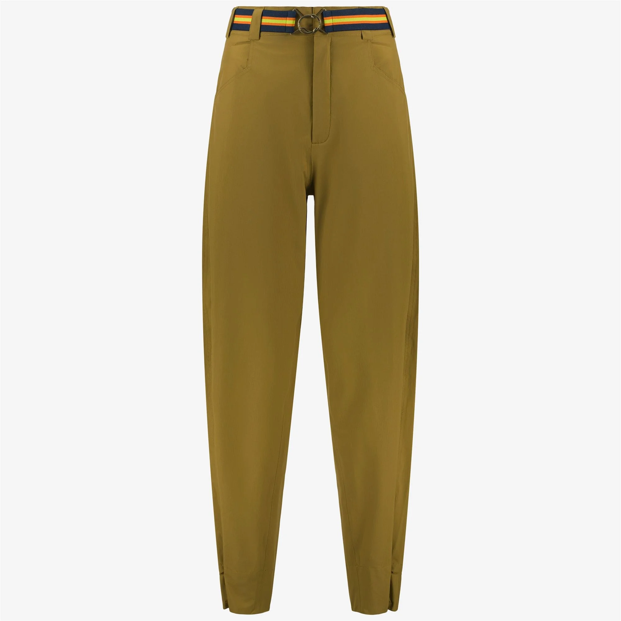 Yellow brown Women's Waterproof Sport Trousers with Adjustable Ankle The Jacobine model from our exclusive K-WAY x Sœur collaboration is characterzied by a modern and comfortable silhoutte. Its loose fit gives it a relaxed look, and the Brown Yellow color, unique to the Sœur brand, makes it a one-of-a-kind piece.These pants are made from 100% recycled nylon, waterproof and breathable, with spacious functional pockets and adjustable ankle buttons. The iconic K-Way belt with its golden buckle is featured at the waist. - K-Way® x Sœur Logo - Waterproof - Windproof - Breathable - Removable belt - Ankle-adjustable buttons - 2 snap buttons at the waist - Flap with K-Way zip Features Description: Pants, Sport Trousers Gender: Woman Season: Spring, Summer Composition Entire: 100% Nylon Style: K2127PW - Color: WJ9