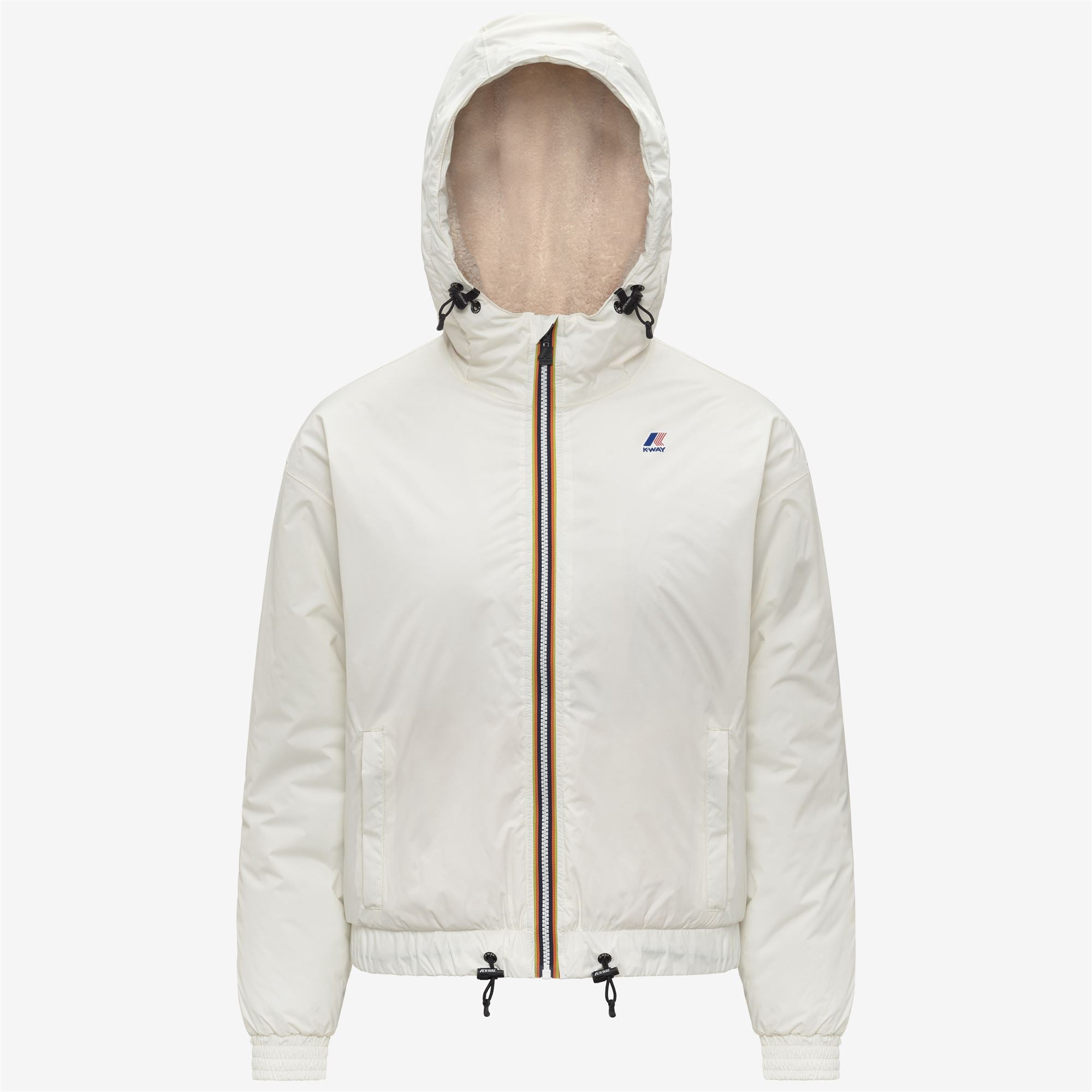 White Women's Short Waterproof Jacket with Sherpa Lining Albine is a women’s short jacket designed for transitional weather and the first signs of cold. Made from waterproof, breathable and windproof ripstop nylon, it features a soft sherpa-effect lining that adds warmth and comfort. The jacket also includes lightweight PrimaLoft® padding, offering insulation without bulk, and an enveloping hood with a full zip closure and chin guard. - Waterproof, water-repellent, windproof and breathable ripstop nylon fabric - DWR (Durable Water Repellent) treatment - Waterproof rating: 10000 mm water column - Breathability: 10000 g/m2/24h - Soft sherpa-effect lining - Lightweight PrimaLoft® padding - Medium warmth rating - Heat-taped seams - Adjustable hood with elastic drawcord - Zip fastening - Inner windproof flap - Elasticated cuffs - 2 zip pockets - Inner pockets - Elasticated hem with adjustable drawcord - Regular fit - Colour-printed logo Features Description: Jackets, Short Gender: Woman Season: Fall, Winter Composition External: 100% Recycled Nylon Padding: 100% Recycled Polyester Lining: 100% Polyester Style: K2133FW - Color: X42