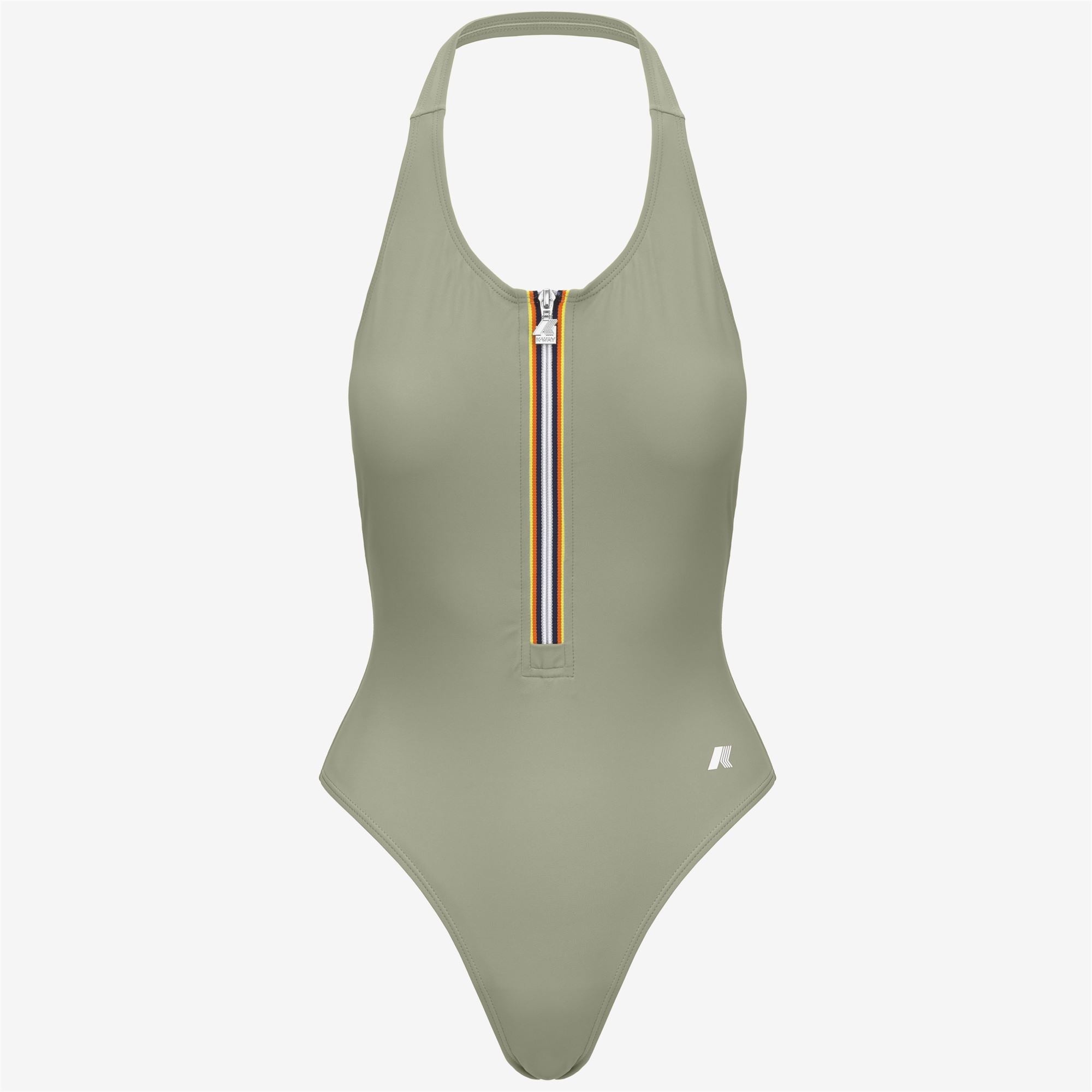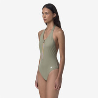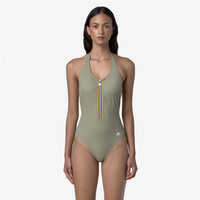 Fatigue green Women's Halterneck One-Piece Swimsuit The Sylvie one-piece swimsuit boasts a feminine halterneck silhouette with a long front zip, embellished with K-Way's iconic striped tape. Crafted from resistant quick-dry Lycra®, the design is detailed with a coloured K-Way logo on the side. - Lycra® - Halterneck style - Zip with striped tape - Regular fit - White printed logo Features Description: Bathing Suits, Swimsuit Gender: Woman Season: Spring, Summer Composition External: 22% Elastane, 78% Polyamide Lining: 25% Elastane, 75% Polyamide Style: K1141JW - Color: T42