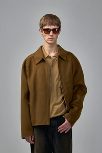 Jacket in a boxy silhouette with a center front zipper in warm brown wool. It has a pointed collar, long relaxed sleeves, welt hand pockets, and adjustable side tabs with buttons to alter the fit. Materials: 90% wool, 10% cashmere Color: brown SKU: 152322 Brand style: B90837-AB7