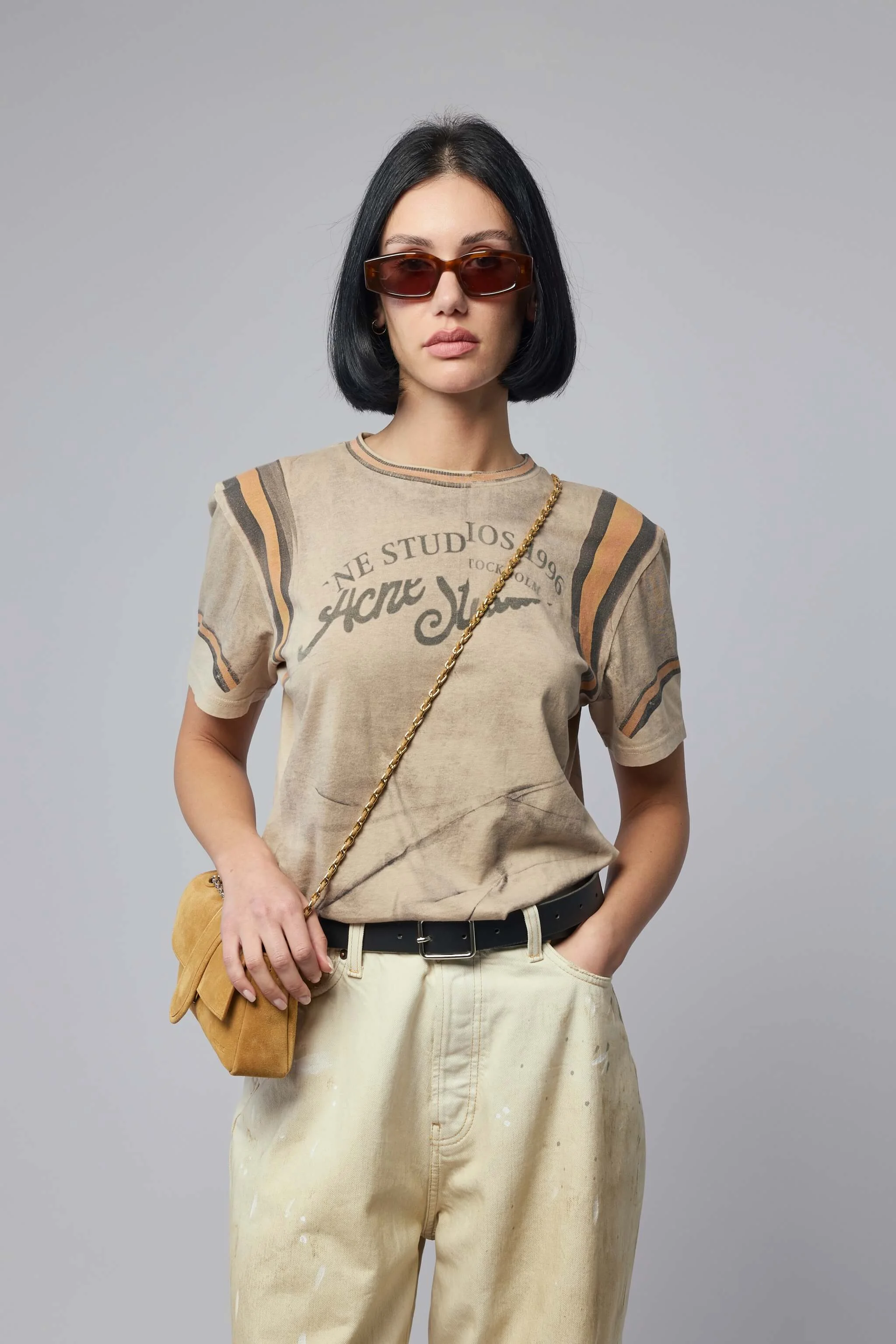 SKU: 155151 Brand style: AL0520 T-shirt with a vintage wash and graphic print, featuring a relaxed silhouette. It combines comfort with a distinct design for everyday wear. - Vintage wash effect - Graphic text on front - Short sleeves - Crew neckline - Relaxed fit Materials: 100% Cotton Color: Sand Beige The model is 1.75m (5.7ft) and wears a size S. The item fits as expected according to standard sizing. Order your usual size.