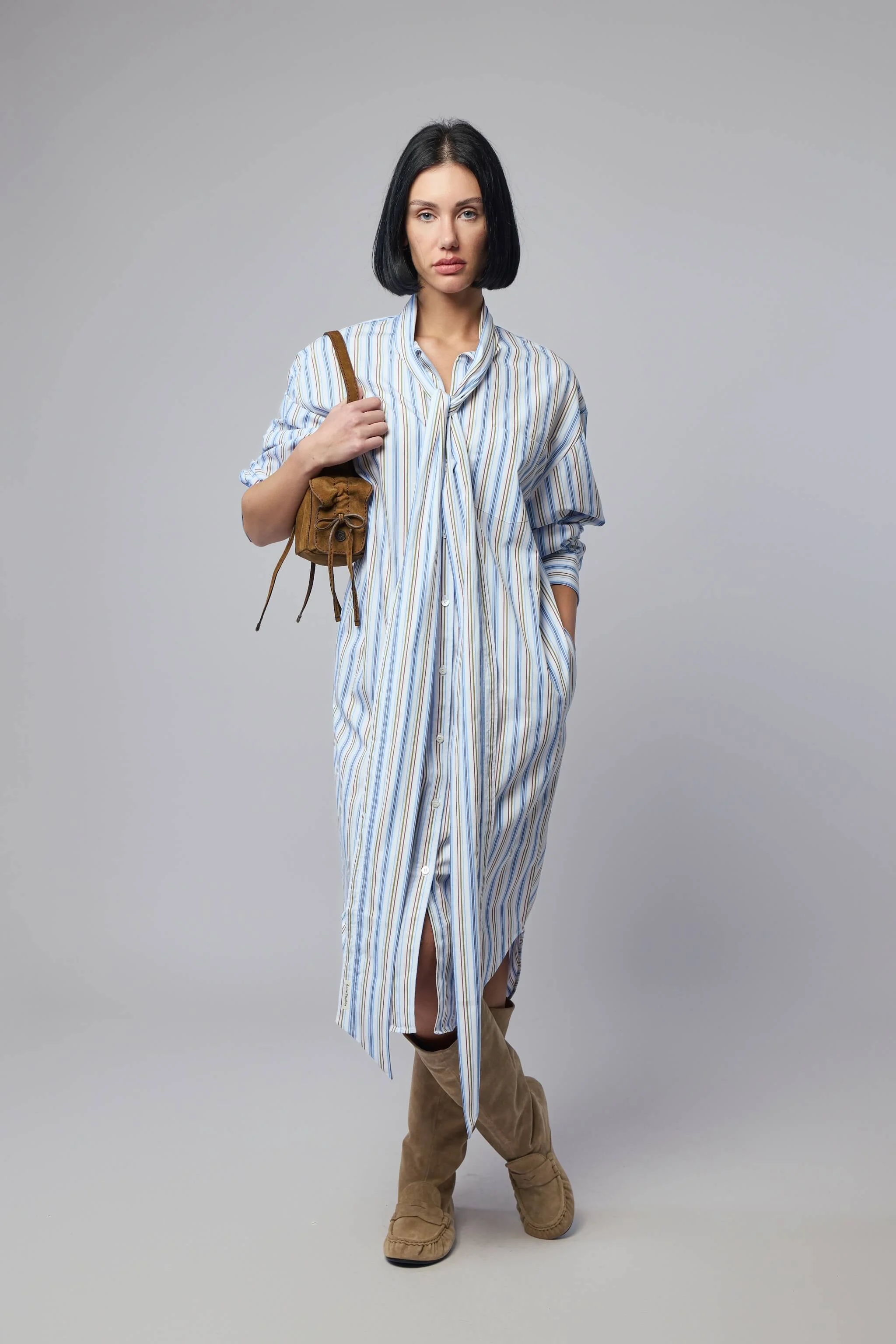 SKU: 155131 Brand style: A20891 Dress with vertical stripes, featuring a bow tie collar and long sleeves. The design offers a relaxed, flowing fit suitable for casual wear. - Vertical stripe pattern - Bow tie collar - Long sleeves - Knee-length - Single chest pocket - Relaxed fit - Button front Materials: 100% Cotton Color: Blue/red The model is 1.75m (5.7ft) and wears a size EU38. The item has a looser cut but is not necessarily oversized. It's intended for a comfortable and easy wear.