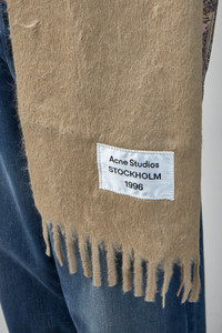- embroidered logo label - weaved contrast frame Materials: 33% alpaca, 25% wool, 22% nylon, 20% mohair Color: camel beige Made in Italy SKU: 146581 Brand style: CA0350- FN-UX-SCAR000401 Size and Fit 28 x 150 cm