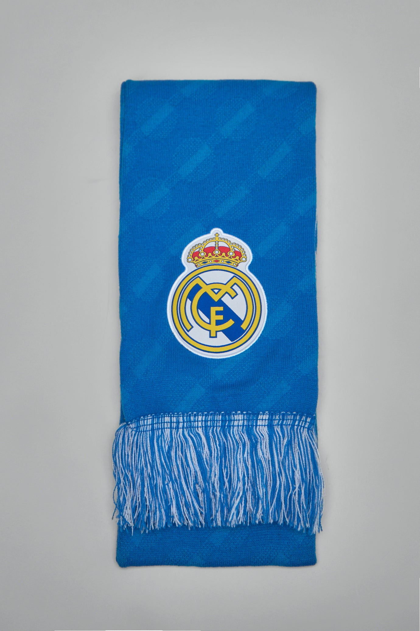 Real Madrid scarf in vibrant blue knit featuring a tonal diagonal jacquard pattern. The piece is presented flat in a long rectangular shape, showing knitted texture and clean stitched edges. Materials: 100% Acrylic Color: blubird SKU: 153767 Brand style: JX3216