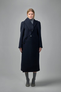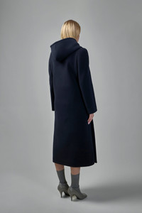 Coat in dark navy with a hooded back and a long, streamlined silhouette. It has an asymmetrical double-breasted front with glossy buttons, slightly puffed shoulders and side pockets in a wool-like fabric. Materials: 100% Wool Color: marine SKU: 152932 Brand style: AA9M1101T522B Size and Fit The model is 1.80m (5.9ft) and wears a size 36. The item fits as expected according to standard sizing. Order your usual size.