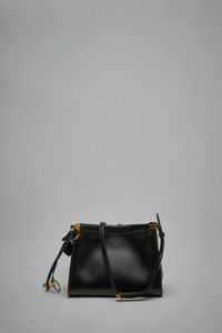 - curved square shape bag that hugs the body - discreet pocket with hinge opening system wrapped with leather, completed by one large front gusset with magnetic closure - signature folding detail on the bottom of the bag - decorative ties with metallic rings - shoulder or cross body carry thanks to an adjustable handle - calfskin leather with a glossy finish - dimensions (cm) : L 20 X H 15 X D 9. Materials: 100% leather Color: noir SKU: 150958 Brand style: AA1S01420CA332 999
