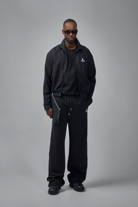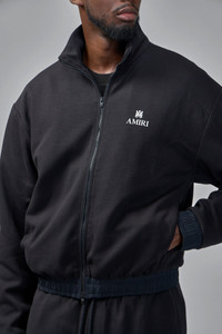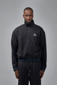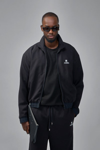 A fitted outerwear piece featuring a high collar and a full-length zipper. The garment has ribbed cuffs and a waistband, providing a snug fit. It is styled with a minimalistic design, showcasing a logo on the chest area. Materials: 52% Polyester, 48% Cotton Color: black SKU: 150998 Brand style: AMOUTJ1011-001