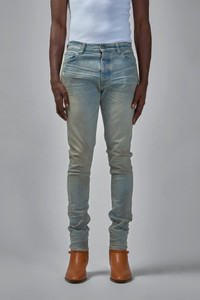 Fitted design with a mid-rise waist. The fabric exhibits a light wash with subtle fading and distressed details. The legs taper down to the ankles, and there are pockets on the front and back. Materials: 92% Cotton, 6% Elastomultiester, 2% Elastane Color: perfect antique indigo SKU: 151008 Brand style: AMDNSY1159