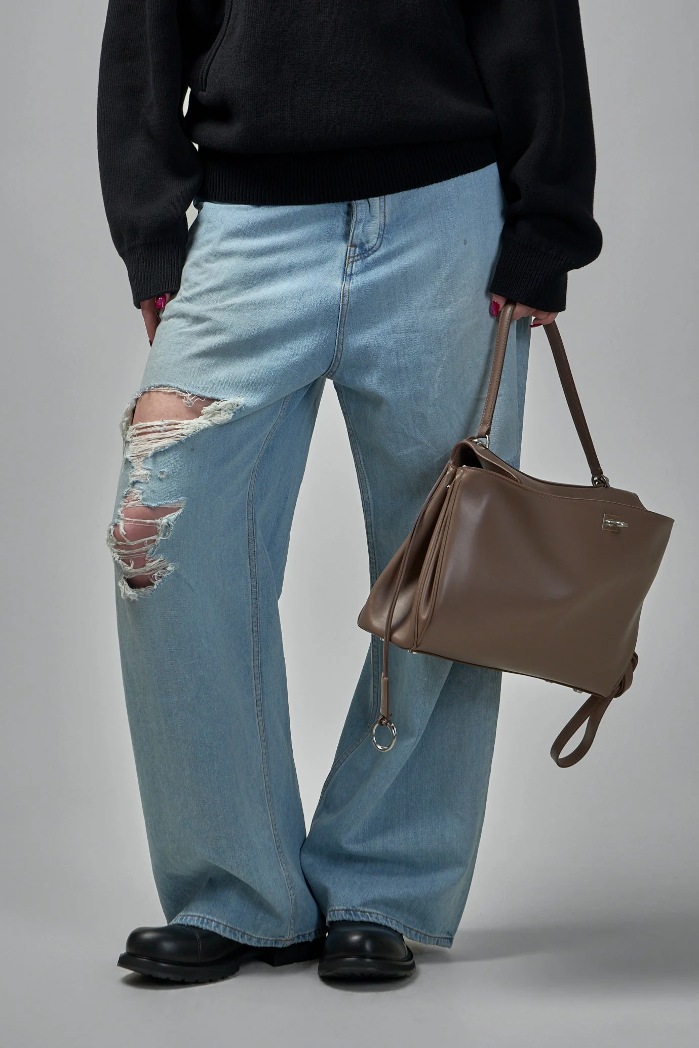 Wide-leg jeans featuring a light blue wash and ripped details on both legs. The denim fabric offers a casual, distressed look that adds character to the outfit. Materials: 100% Cotton Color: light blue SKU: 153427 Brand style: 849951TTWA3 Size and Fit The model is 1.80m (5.9ft) and wears a size S. The item has a looser cut but is not necessarily oversized. It’s intended for a comfortable and easy wear.