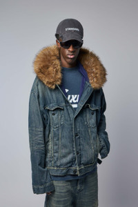 SKU: 153448 Brand style: 848020 TTW76 3394 Jacket with distressed denim look and fur-lined collar, offering a blend of vintage and luxury style. The structured front and side pockets add functionality to its fashionable design. - Distressed denim fabric - Fur-lined collar - Button closure - Front flap pockets - Side pockets Materials: Main material 1: 100% cotton; Main material 2 (animal-free fur): 100% polyester; Lining: 100% cotton; Pocket lining: 65% polyester, 35% cotton; Hood filling: 60% silk, 40% polylactide Color: navy/green/yellow