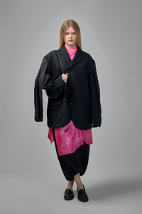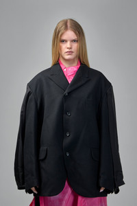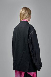 Oversized black single-breasted blazer jacket with notched lapel and dropped shoulders. It features contrasting satin-style sleeves, a button-front closure, a welt chest pocket and flap hip pockets for a tailored yet relaxed look. Materials: 100% Polyester Color: black SKU: 153347 Brand style: 1P-J018-W25 Size and Fit The model is 1.80m (5.9ft) and wears a size M. The item has a looser cut but is not necessarily oversized. It’s intended for a comfortable and easy wear.