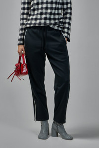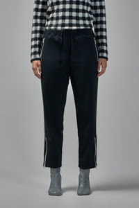 Track pants in black with a relaxed straight silhouette and cropped ankle length. It features an elastic draw waistband with drawstring, contrasting white side zippers, and ankle zip openings for adjustable fit. Materials: 100% Polyester Color: black SKU: 153348 Brand style: 1Z-T503-PER Size and Fit The model is 1.76m (5.8ft) and wears a size M. The item fits as expected according to standard sizing. Order your usual size.