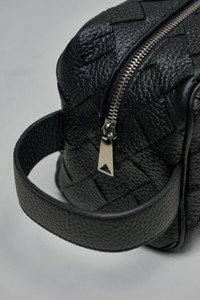 Pouche with a rectangular, boxy silhouette in woven black leather. Features a top zipper with a silver triangular pull and a wide side carry loop. Materials: 100% Leather Color: black, silver SKU: 150968 Brand style: 729295VCPQ18803