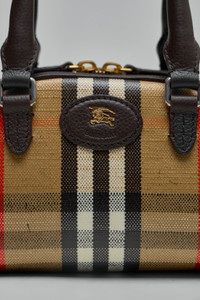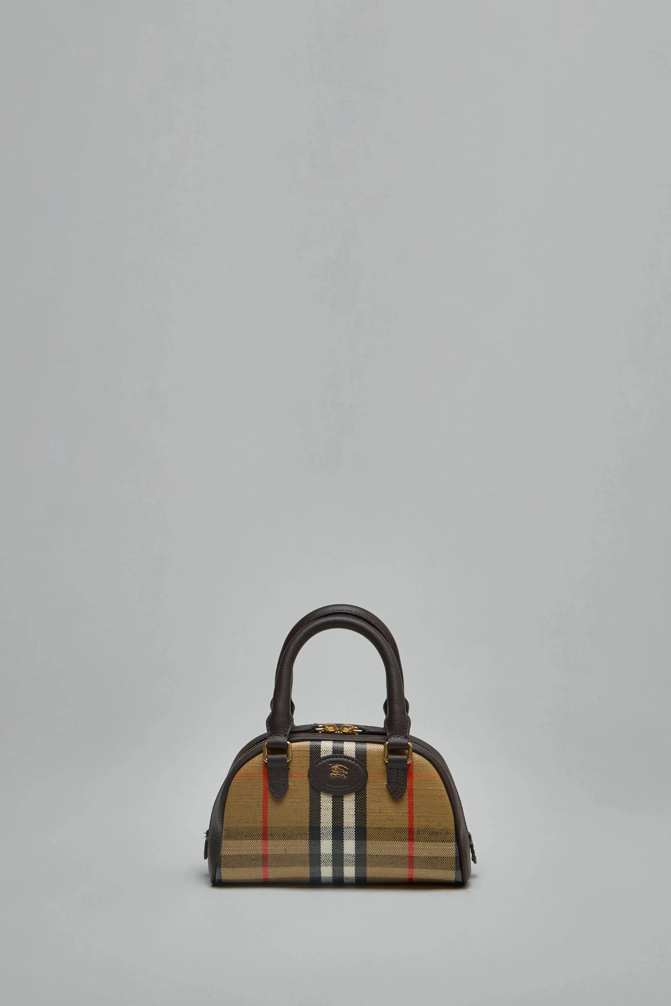 Top handle bag with a compact dome silhouette in classic check canvas. It features dark brown leather trim, double rounded handles, gold-tone hardware and a detachable shoulder strap for versatile carry. Materials: 69% cotton, 21% viscose, 10% linen; Trim: 100% calf leather; Lining: 100% cotton Color: sand beige SKU: 153003 Brand style: 81152811.0