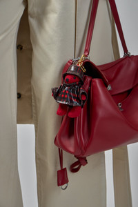 Keychain of a plush teddy charm dressed in a glossy red-and-black tartan raincoat with a matching bucket hat. It hangs from a gold-tone clasp and key ring, featuring a knitted red body with stitched black eyes and an embroidered nose. Color: red SKU: 153015 Brand style: A4535