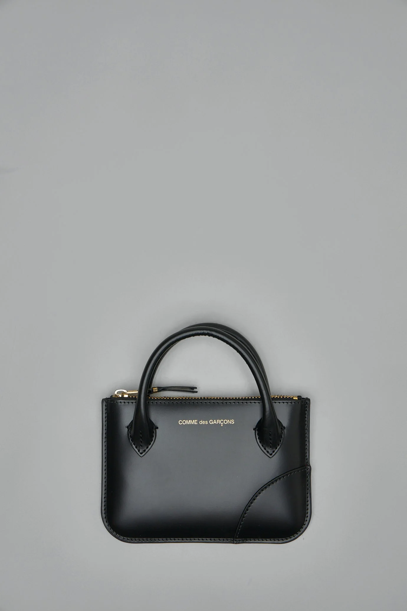 Top handle bag made from smooth black leather with a compact rectangular silhouette. It has dual rolled top handles, a gold top-zip closure and gold COMME des GARCONS logo stamping on the front. Materials: 100% Cowhide Color: black SKU: 153789 Brand style: SA8100HA