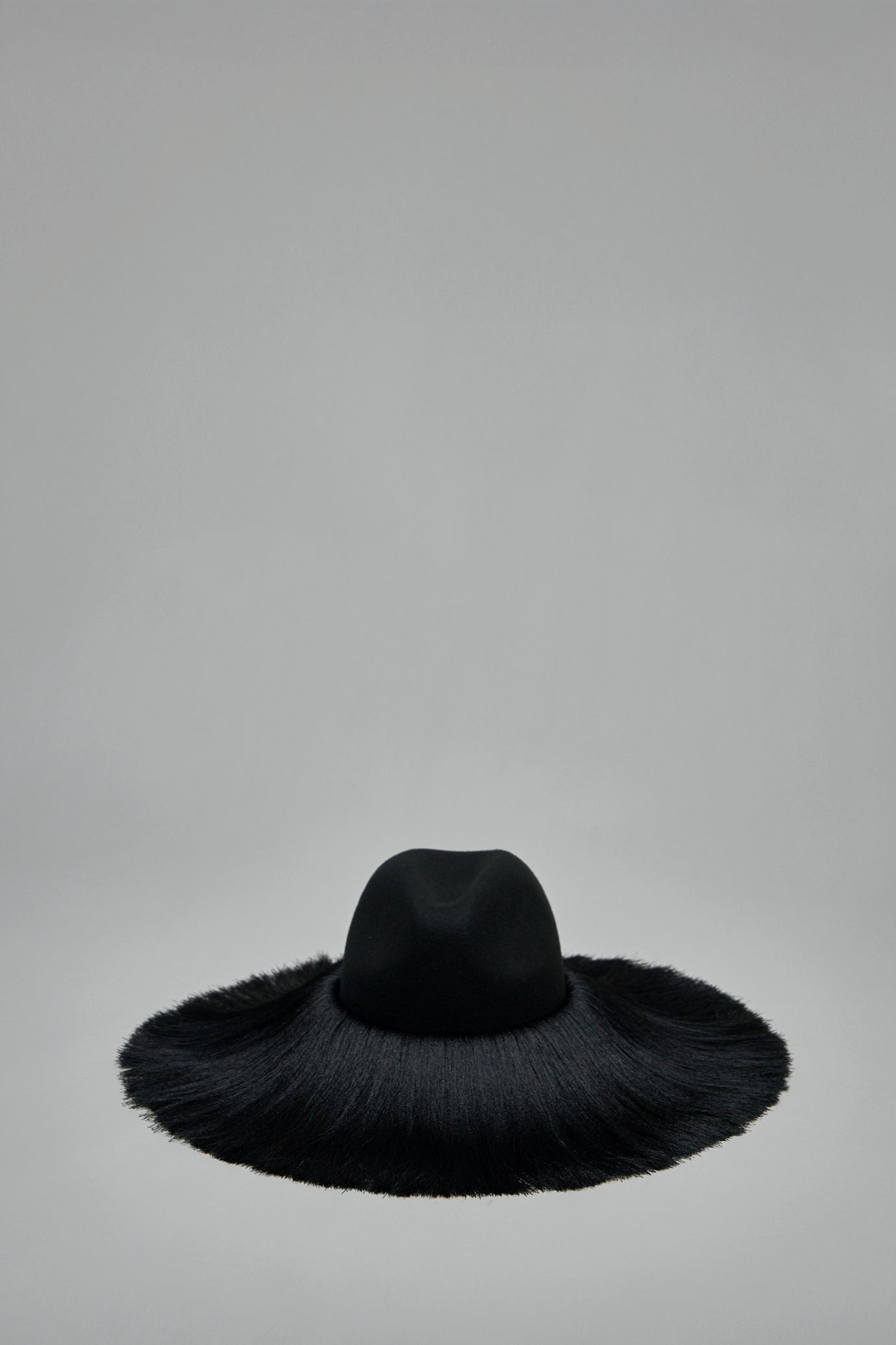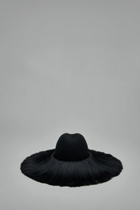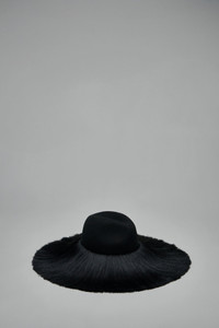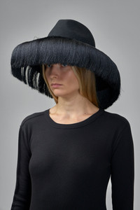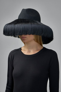 Hat with a structured felt crown and an ultra-wide fringed brim. The brim is finished with long, silky black fringe that forms a dense, circular silhouette. Sculptural center dent and smooth felt top complete the dramatic design. Materials: 100% Wool Color: black SKU: 153319 Brand style: GP-K601-W25