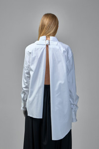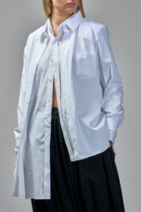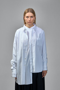 Oversized white button-up shirt with layered front panels and a longline, relaxed silhouette. It features a pointed collar, single chest pocket and long sleeves finished with button cuffs. Materials: 100% Cotton Color: white SKU: 153315 Brand style: GP-B014-W25 Size and Fit The model is 1.76m (5.8ft) and wears a size M. The item has a looser cut but is not necessarily oversized. It’s intended for a comfortable and easy wear.