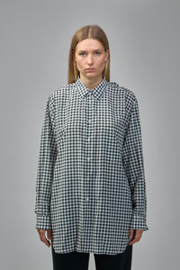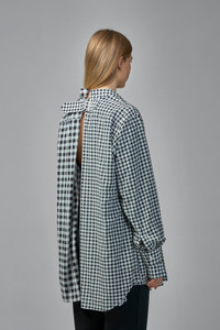 Shirt in black and white gingham featuring an oversized, relaxed silhouette with contrasting check panels. It has a button-front, pointed collar, long sleeves and an open back finished with a buckled strap. Materials: 100% Cotton Color: black, white SKU: 153317 Brand style: GP-B003-W25 Size and Fit The model is 1.76m (5.8ft) and wears a size XS. The item has a looser cut but is not necessarily oversized. It’s intended for a comfortable and easy wear.