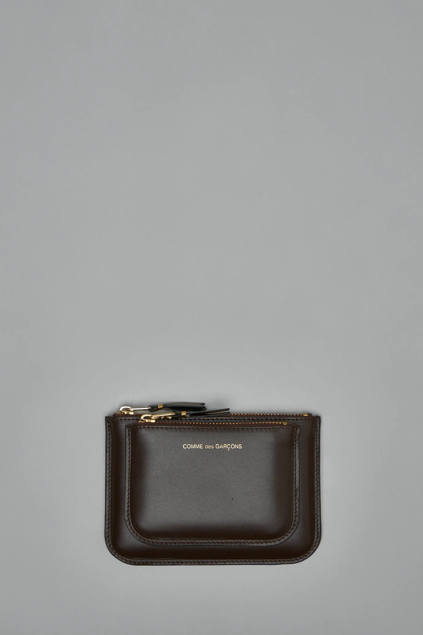 Small leather zip wallet featuring dual top zippers and gold-tone hardware. It has a smooth dark brown finish with a gold COMME des GARCONS logo on the front. Materials: 100% Calf leather Color: brown SKU: 153791 Brand style: SA8100OP