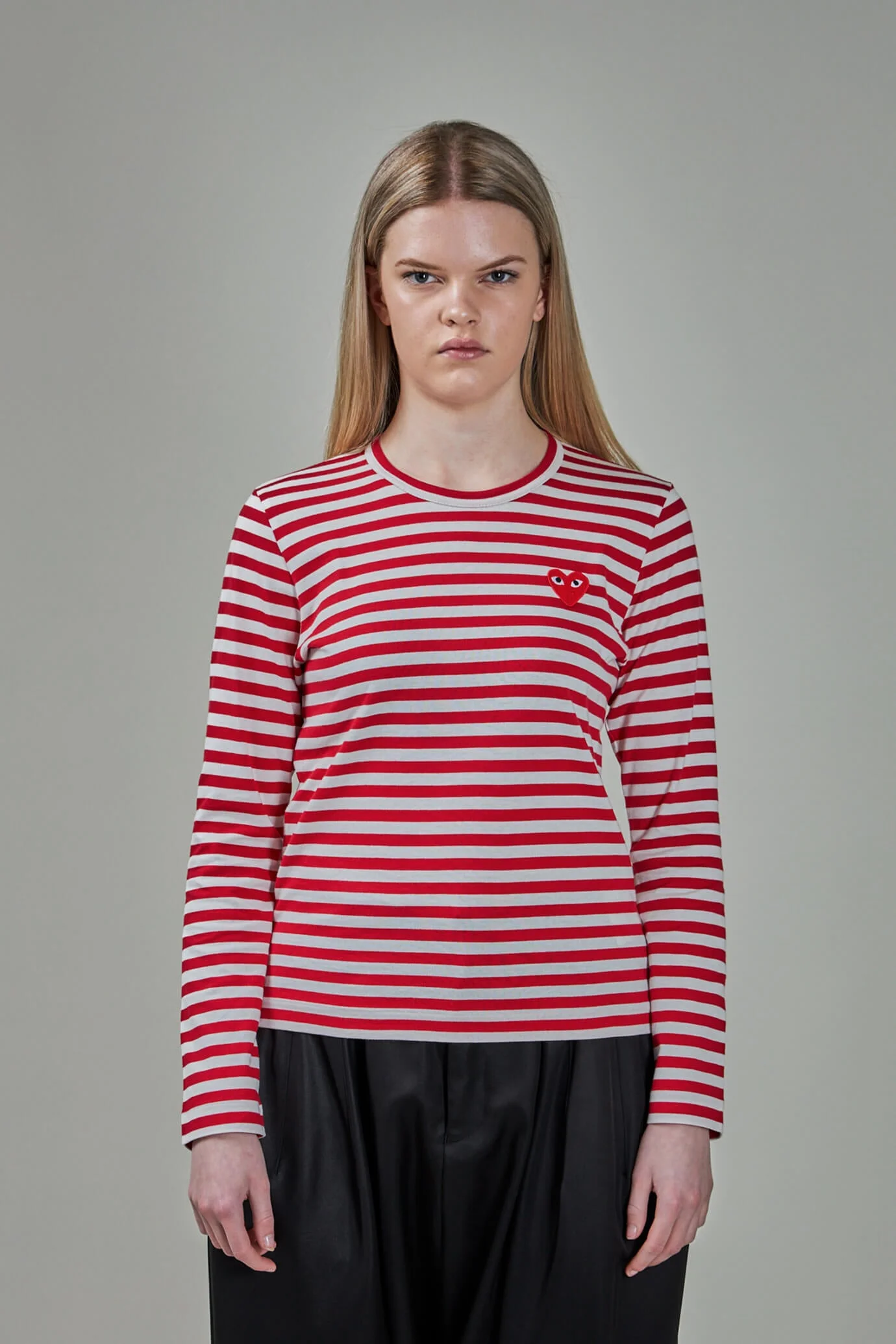 SKU: 128598 The striped longsleeve features the well-known CDG heart on the chest. The round neckline and regular fitting gives a Comme des Garcons appropriate look. Materials: 100% Cotton Color: Renee wears a size M. Renee is 179 cm and a size Small in tops, a size 38 in bottoms and a size 28 in Denim.