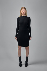 Ribbed knit long-sleeve dress with a high mock neckline and knee-length hem. It has a slim, bodycon silhouette and a small tone-on-tone logo at the chest. Materials: 70% Viscose, 30% Polyester Color: black SKU: 152348 Brand style: 325MRO690FI0001