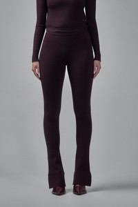 Pants with a high rise and close-fitting silhouette in deep plum. Made from a smooth stretch knit, they feature a center front seam, slight flare with a front hem slit, and an ankle strap tab. Color: 4010 burgundy SKU: 152746 Brand style: 425MPA441FI0001