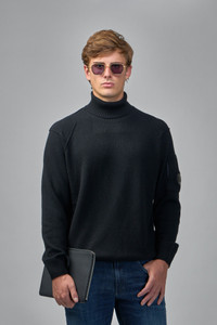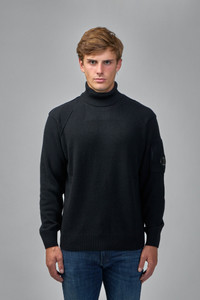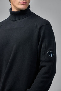 Turtleneck knit sweater in black with a high ribbed roll neck. Features long sleeves, ribbed cuffs and hem, a relaxed silhouette and a circular lens patch on the upper sleeve. Materials: Lambswool Color: black SKU: 152011 Brand style: 19CMKN166A110149A
