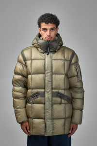 A down jacket with a quilted design, featuring a high collar and a hood. It includes multiple zippered pockets for added functionality, making it a practical choice for colder weather. Materials: 100% Nylon Color: fallen rock SKU: 152019 Brand style: 19CMOW195A110419A Size and Fit The model is 1.89m (6.2ft) and wears a size L. The item has a looser cut but is not necessarily oversized. It’s intended for a comfortable and easy wear.