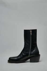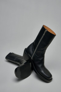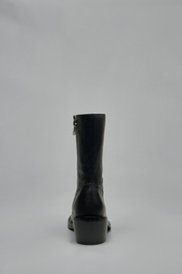 Boots with a mid-calf shaft in smooth black leather, featuring a full-length silver side zipper and visible stitched paneling. They have a rounded toe, a chunky stacked block heel, and a raised welted sole. Minimalist polished finish with metal zipper hardware completes the design. Materials: 100% Leather Color: black SKU: 152167 Brand style: 252-021706-102-00070