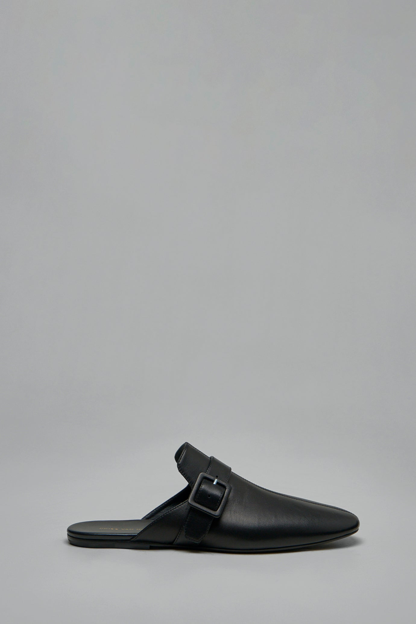 Slip-on leather mule with a pointed toe and an adjustable buckle strap across the instep. Smooth black leather upper features a center topstitch seam and a low flat sole for a streamlined profile. Materials: 100% Leather Color: black SKU: 152168 Brand style: 252-021712-112-00130