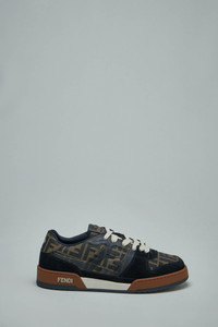 Low top sneakers with FF monogram canvas upper, black suede overlays and a brown rubber midsole. It has cream laces, a translucent TPU side 'F' detail and a branded heel tab. Materials: Jacquard, suede, rubber Color: nero tabacc nero ice SKU: 150512 Brand style: 7E1688 AQ6I F1PXA